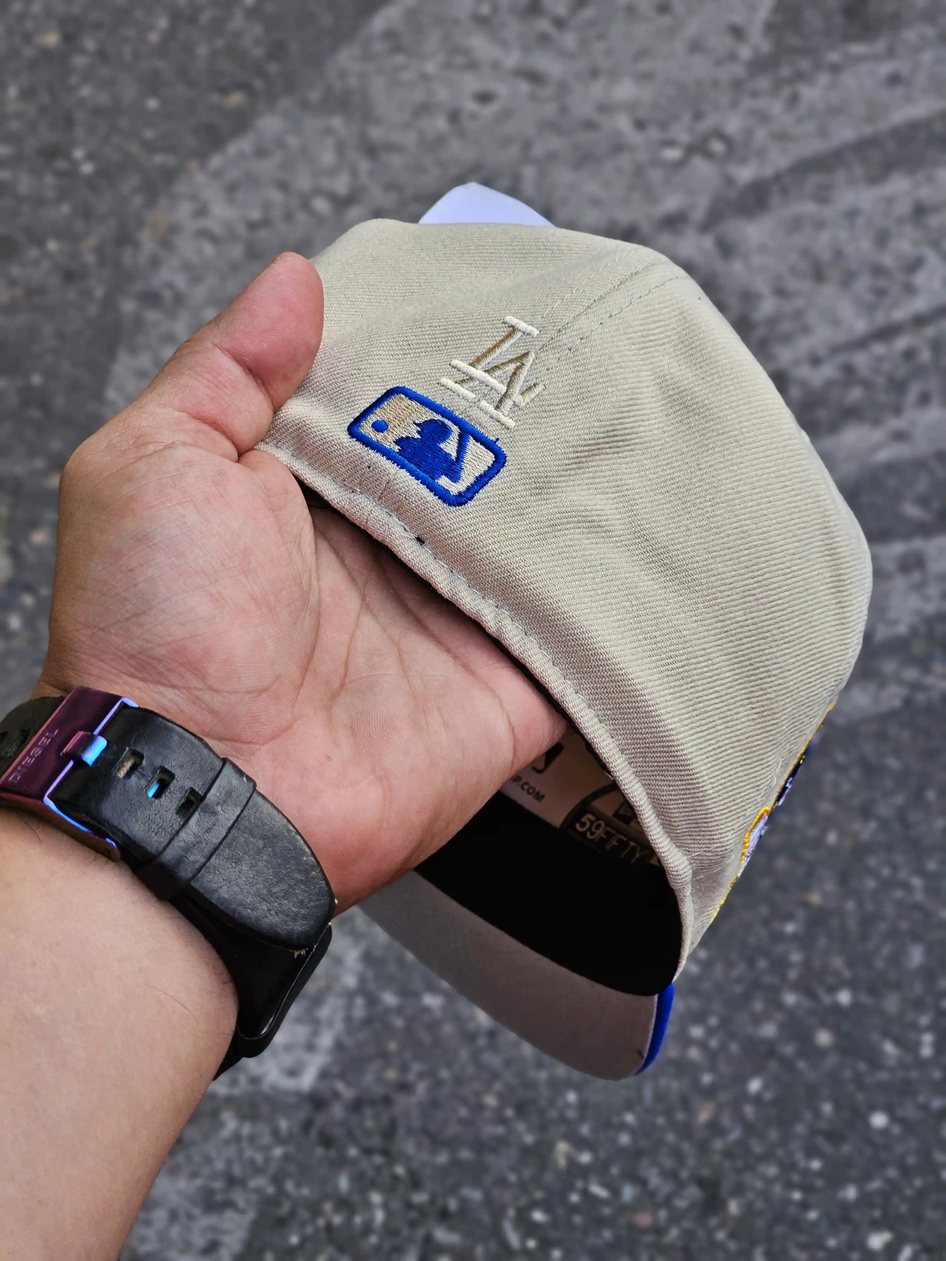 GORRA CERRADA LOS ANGELES DODGERS BEIGE COLOR BRUSH VISOR AZUL